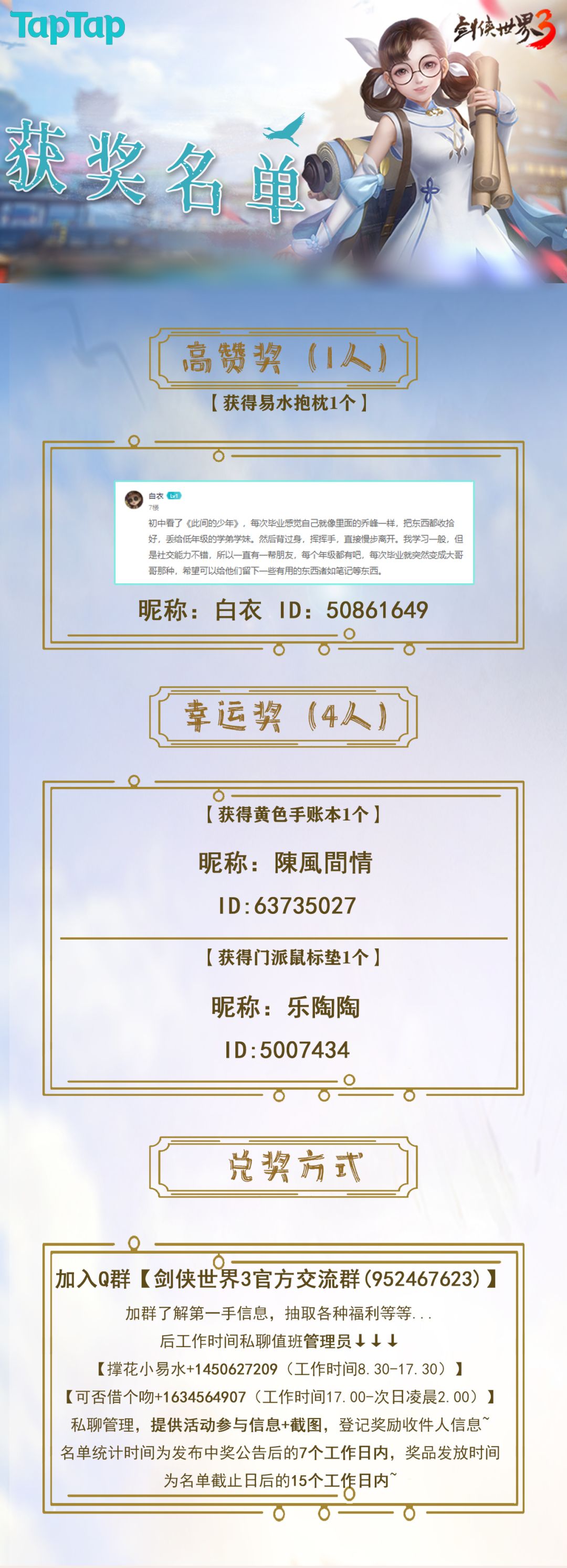 恭喜以上获奖少侠|•ω•)ノ 希望各位少侠多多参与~未来还有更多精彩活动等着大家~