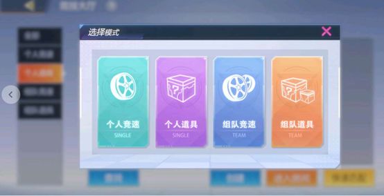 竞技大厅分为个人竞速/个人道具/组队竞速/组队道具四种竞技模式。