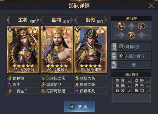 他的搭配队友需要自带一定的配合,毕竟汉谟拉比只能为队友提供额外的输出机会,并不能改变将领自身的强度,只有优秀的将领才能将这额外的输出发挥到最大,所以一般情况下搭配的双核都属于强度较高的将领,如吕布+阿提拉或本多忠胜+神原康政等等。