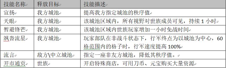 3.1 世族技能分为对城池技能与对世族技能两种。
