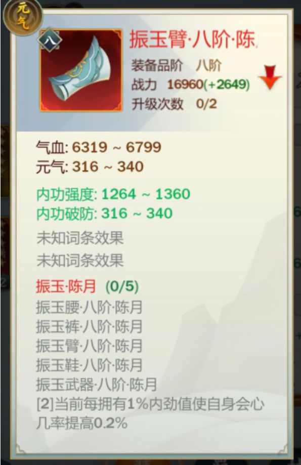 2鬼工+4振玉/3鬼工+3振玉。振玉版本之子,但是陈月用振玉需要2个以上的内劲回复,全程内劲要保持70%以上才能吃满振玉的套装属性。振玉的套装属性会心可以适当降低到2500-3000。