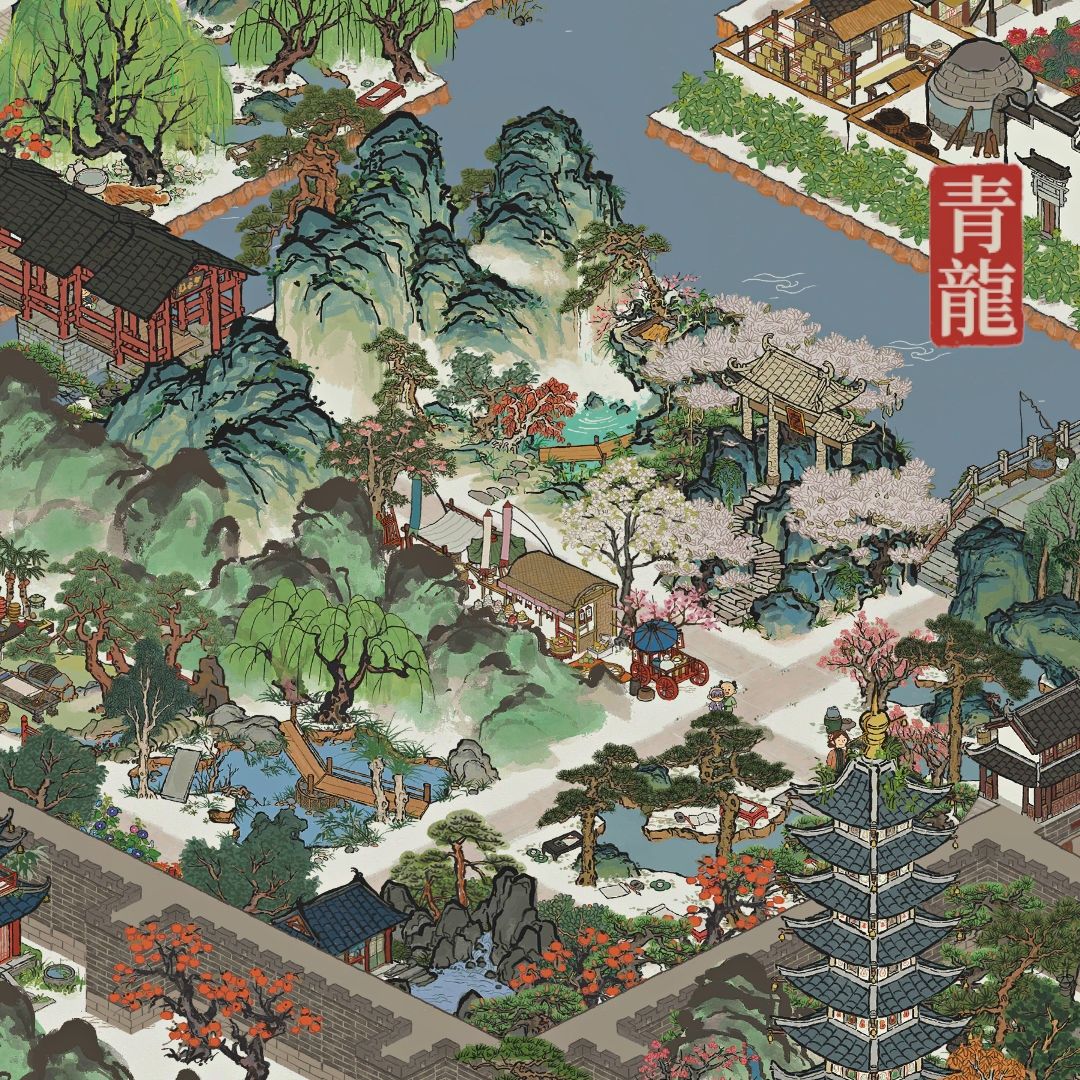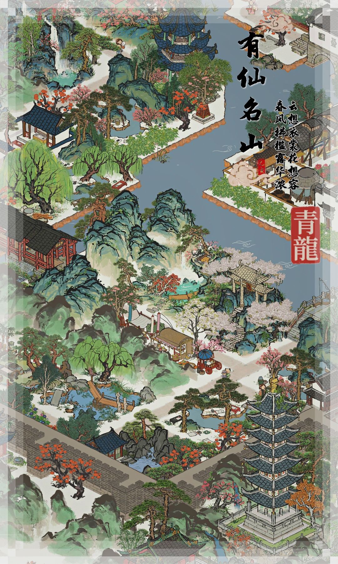 这是长庆寺,我用补天石加快速度建造完成的,为了提前给他大家看看,主要是建筑都是庙宇相关建筑,河边边上是今天限时探险任务奖励的椰树小岛,其他的是家祠和生产类建筑!
