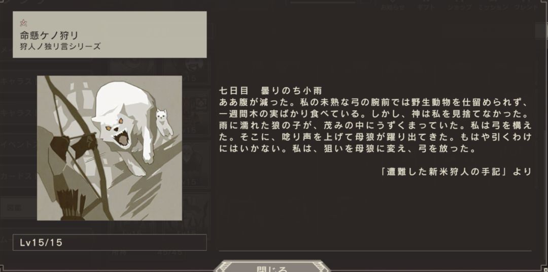 啊,肚子饿了。我用不成熟的弓的能力无法捕获野生动物,一周只吃树木的果实。但是神没有抛弃我。被雨淋湿的小狼蹲在树丛中。我拉开了弓。这时,母狼呜呜地叫了起来。已经不能拉开弓弦了。我的目标变成了母狼,放开了弓弦。