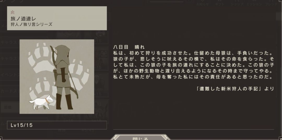我第一次成功狩猎到了猎物。被杀死的母狼倒下了。小狼悲伤地吠叫着,我在旁边看着母狼生命的流逝。于是我决定带着这只小狼去旅行。直到小狼能和其他野生动物战斗为止,我都会保护他。虽然我还不成熟,但我认为夺走母亲的我有责任保护他。