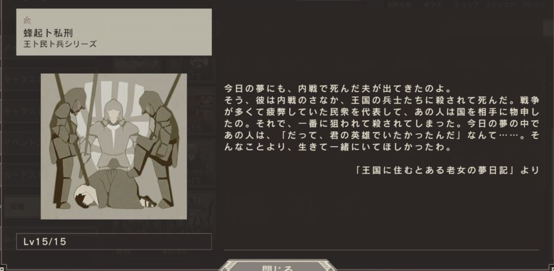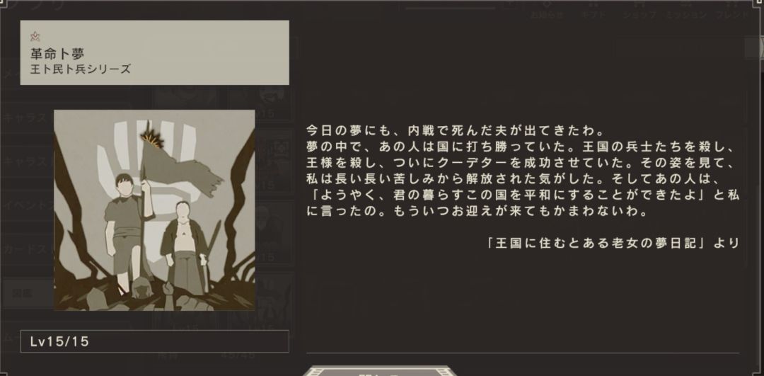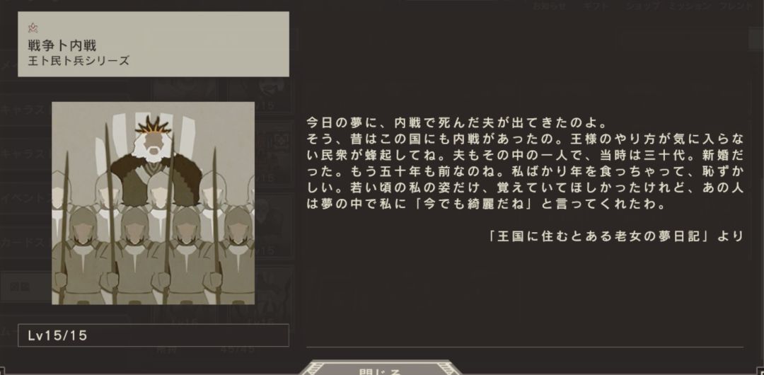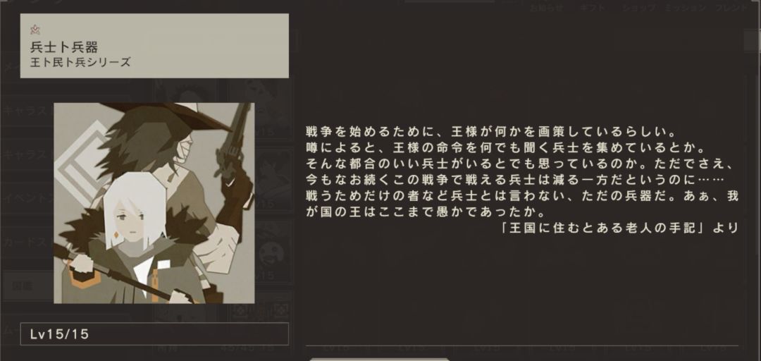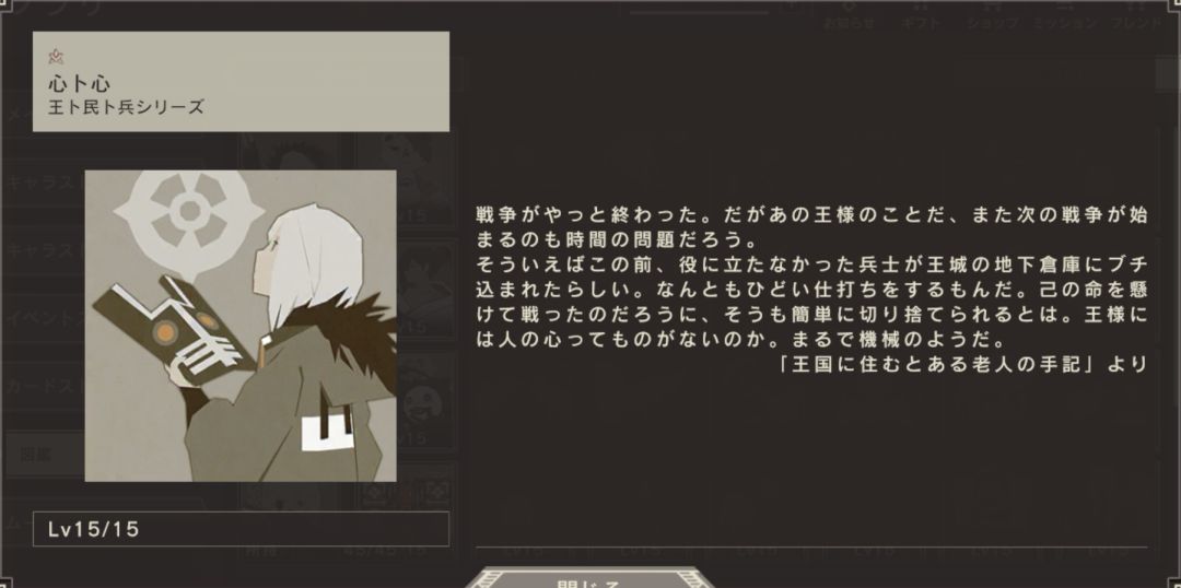 为了发动战争,国王似乎在策划着什么。根据传闻,他聚集了所有听候皇帝命令的士兵。你以为有那么方便的士兵吗。本来,现在仍能继续在这场战争中战斗的士兵在不断减少……但这些士兵并不是为了战斗而存在的,不只是单纯的兵器而已。唉,我们国家的国王愚蠢到这种地步了吗。