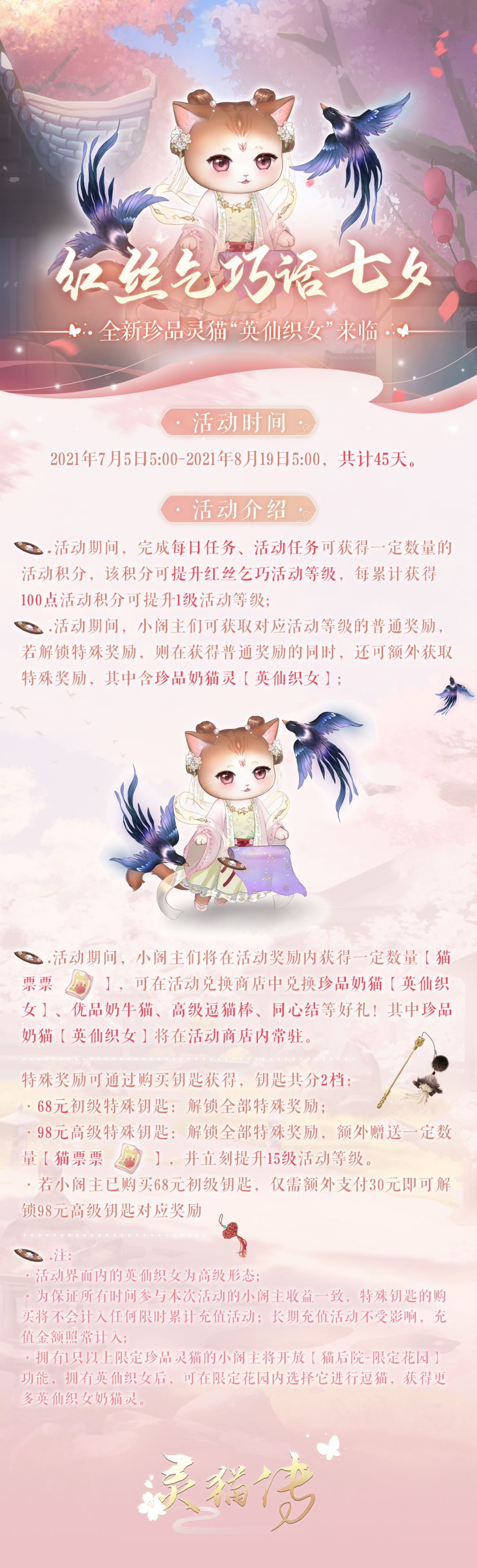 7月5日5:00-8月19日5:00,完成每日任务、活动任务可获得一定数量的活动积分,该积分可提升红丝乞巧活动等级。活动期间,小阁主们可获取对应活动等级的普通奖励,若解锁特殊奖励,则在获得普通奖励的同时,还可额外获取特殊奖励,其中含珍品奶猫灵【英仙织女】。此外,在活动奖励内获得一定数量【猫票票】,可在活动兑换商店中兑换珍品奶猫【英仙织女】、优品奶牛猫、高级逗猫棒、同心结等好礼!详细活动说明请查阅下图。