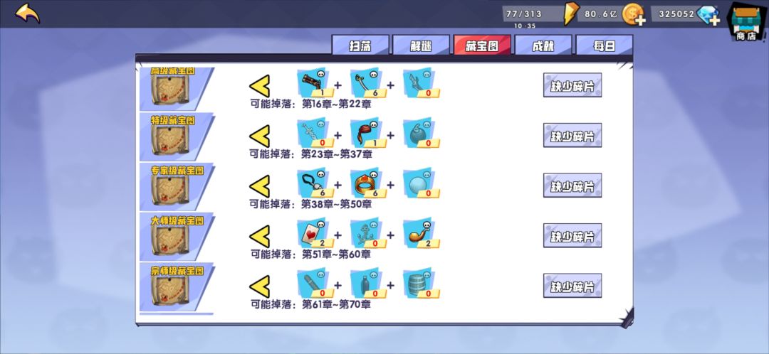 步骤:进入关卡——通关第一个岛屿(有藏宝图碎片)——拾取奖励(藏宝图碎片)——重置关卡(底下有重置按钮);按照这个步骤一直重复,直到上限为止(上限为第一个岛屿不出藏宝图碎片),然后你就可以刷其他藏宝图碎片了,方法跟上述同理。(有超级扫荡快一点)