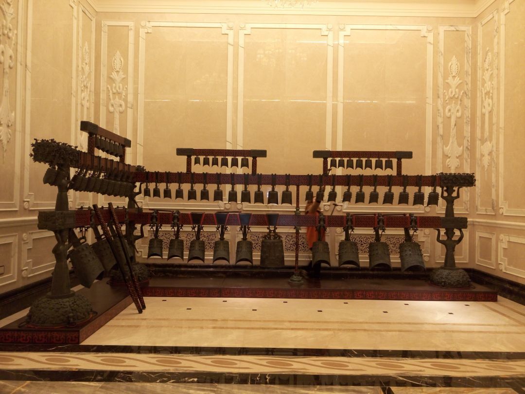 1978年湖北随县城郊的擂鼓墩出土战国初期的曾候乙墓编钟,共六十五枚。被称为我国古代编钟之王,每个钟体上都刻有错金篆体铭文,正面刻“曾候乙乍时”(曾候乙作)。