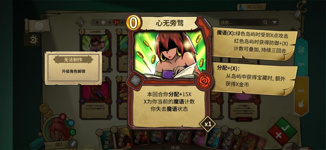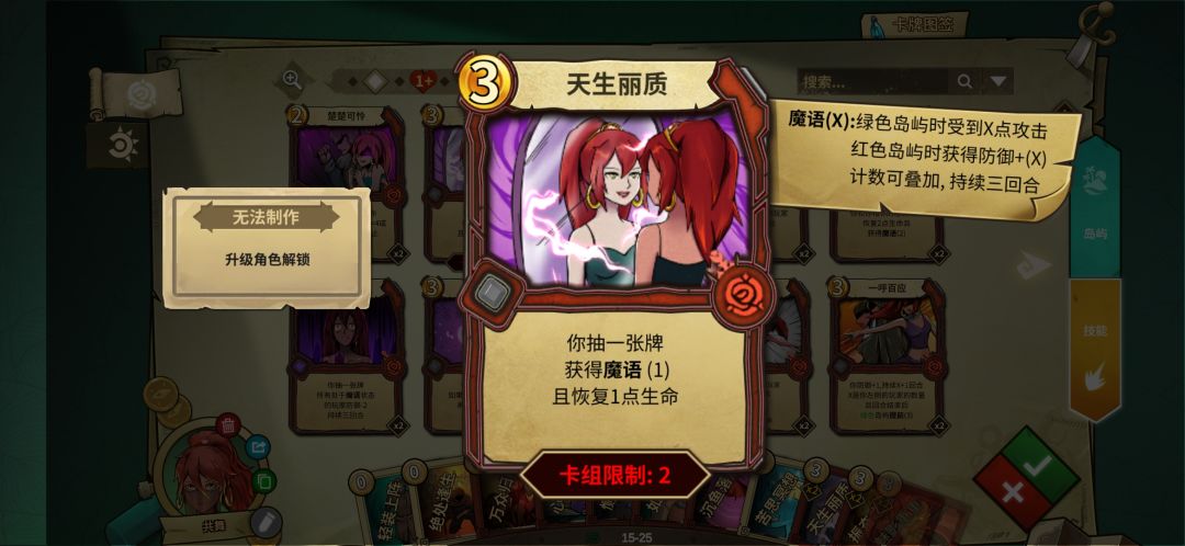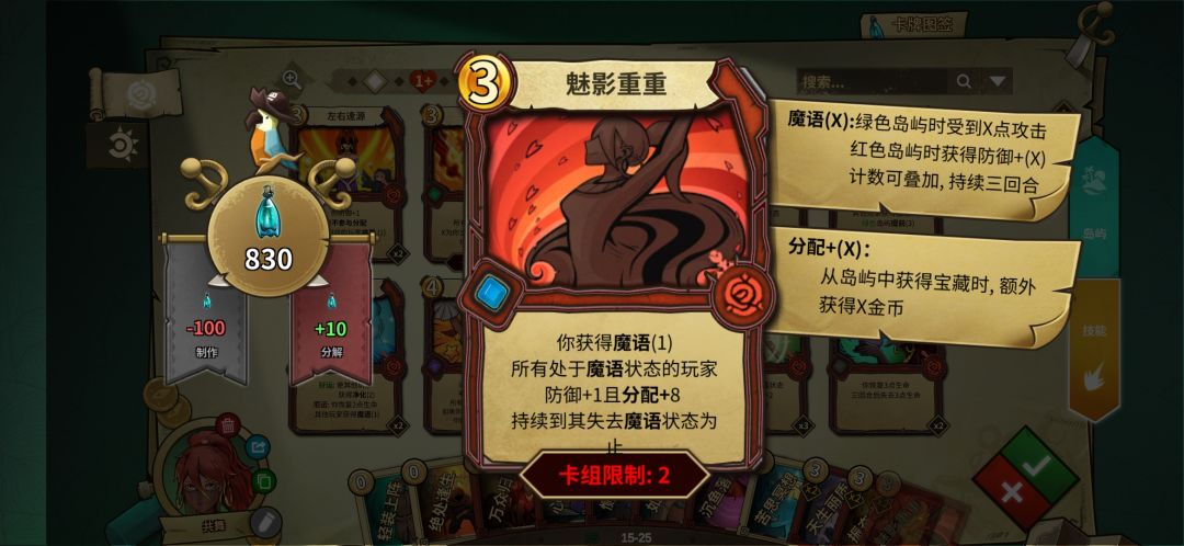 但是魔语消失沉鱼落雁效果就消失了,所以需要上面这两张魔语续航,一张叠魔语时能加防御,一张能过牌和加血。