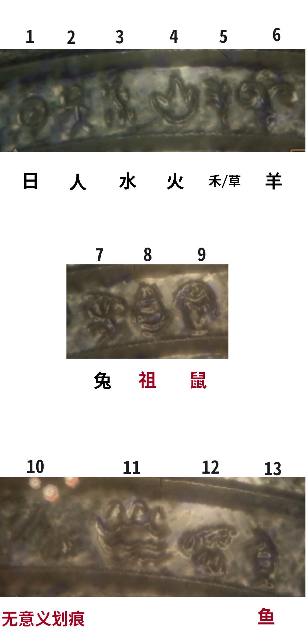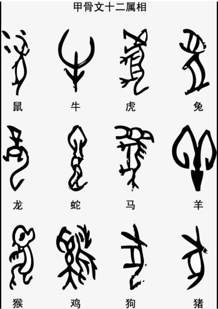 内圈主要为甲骨文,是中国商朝晚期王室用于占卜记事而在龟甲或兽骨上契刻的文字,又称“ 契文”“ 甲骨卜辞”或“ 殷墟文字”,象形意义比较明显,是已知最早的成熟汉字。