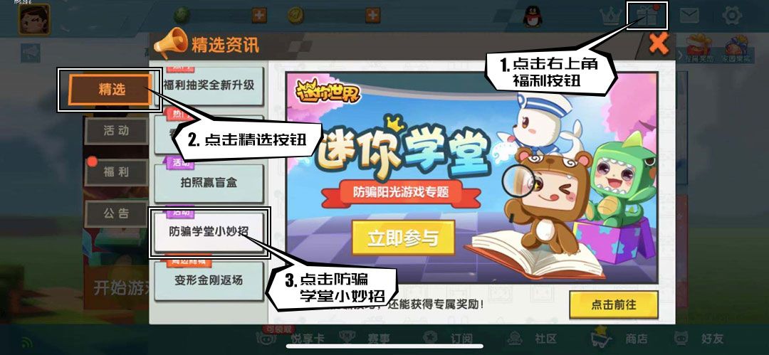 首先,小伙伴们可以先点击右上角福利按钮,再点击“精选”,看到【防骗学堂小妙招】了吗?学习最新防骗技巧,点击前往就能进入迷你学堂啦!