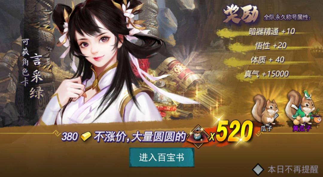 新一月的百宝书中,加入了任窈窈和言采绿的角色卡,无论是仗剑行天涯,还是飞升成真仙,二位女侠一定可以助大侠一臂之力!另外,还有《瓜子》宠物卡、《香肠》宠物卡、《黄瓜子》宠物卡以及凌霄残章包和空白秘籍等奖励等着大侠,快来升级百宝书,兑换想要的奖励吧~