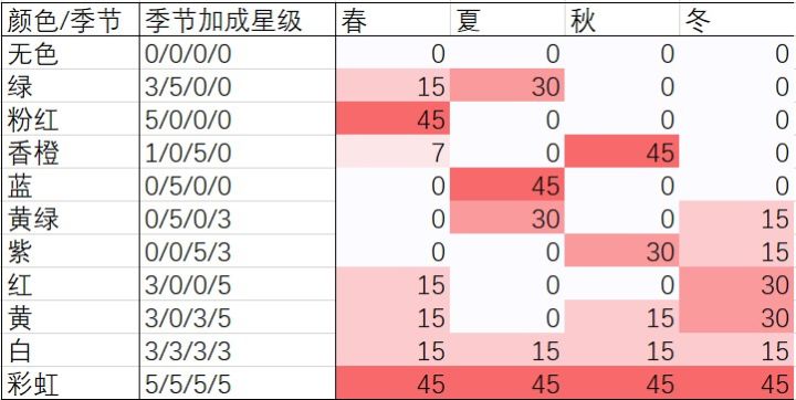3.对应【季节加成星级】,颜色和香味的加成数值有【0、7、15、30、45】(7只出现过一次)。