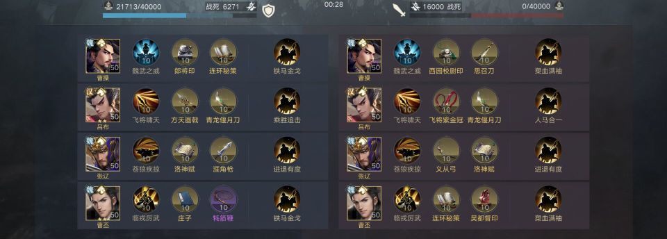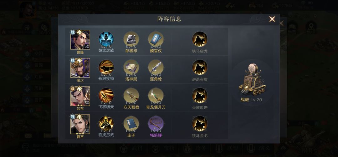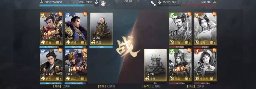 汉吕携带输出型宝物,青龙偃月刀和方天画戟。青龙偃月刀对敌军高武力伤害的同时,对于兵力低于50%的目标,百分百造成2倍伤害,和主动技能飞将啸天武力高于敌方目标造成2倍伤害非常般配;方天画戟则是群体攻击,可以对周身40步范围内最多3支敌方部队发动无视护盾的武力攻击,并有50%几率使目标武力减少12.5%。在曹丕和他宝物的加成下,携带着青龙偃月刀和方天画戟的汉吕可以在极短的时间内就击溃一支队伍,输出可以说是非常爆炸。