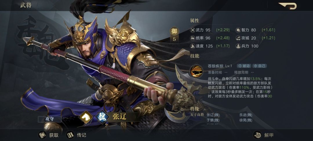 然后是曾经的版本之子,张辽。张辽,曾经的版本之子,以靠闪避率单刷过九级而闻名。现如今虽已被削弱,但其技能苍狼疾掠仍保持着不低的闪避率,且每次触发闪避,就可以对统率最低的敌方部队发动武力攻击,在第15秒时,还可以对敌方全体发动武力攻击,且有50%几率使其命中减少15%。
