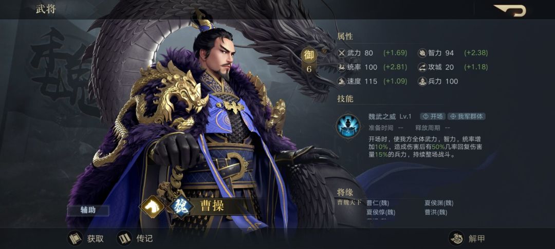 其次是曹丕的父亲曹操,其技能魏武之威可以增加我方全体武力,智力和统率,造成伤害后有50%几率回复伤害量15%的兵力且持续整场战斗。我方全体武力,智力和统率加成的同时造成伤害还能回血,如此强大的辅助技能,不愧是三皇之一。