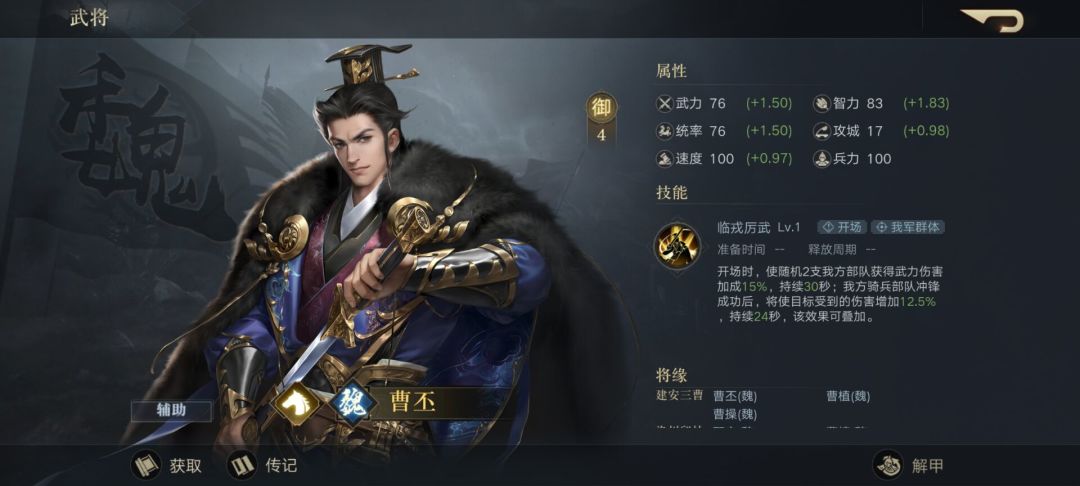 首先是作为四骑核心的曹丕,其技能临戎厉武可以使随机2支我方部队获得15%的武力伤害加成且我方骑兵部队冲锋成功后,将使目标受到的伤害增加12.5%,效果可叠加,这也是曹丕被誉为四骑核心的原因。