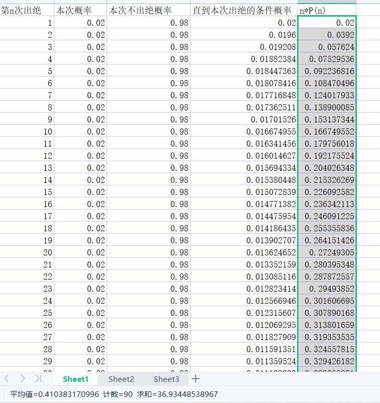 用数学期望来算一下,平均几次能出一个绝吧。依据这个离散型期望公式讲