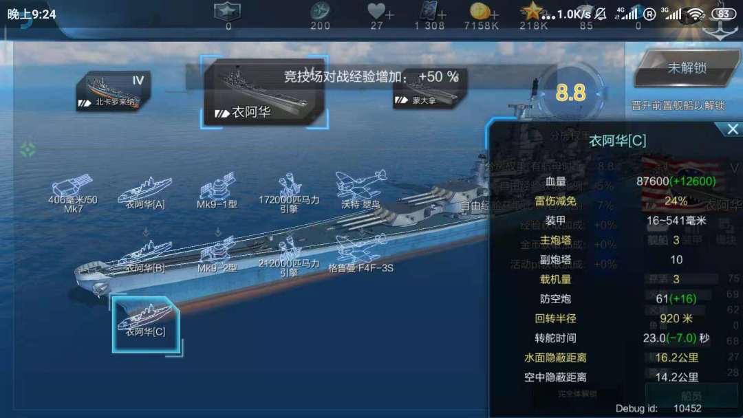 设计理念:一艘可以点灯和用煎包有输出但是弱化常规火力的战列舰。 其煎包对巡洋杀伤能力期望能达到可以一定程度的对巡洋构成压血线的程度。其主炮输出也依旧可以接受,毕竟只是减了微不足道的33%(),但是其总输出肯定不如伊利诺伊的。因为拆除了后甲板所有的防空炮,所以其防空能力有所下降,但是补偿是她有战斗机选项,四架海鹞的护航可以使她拥有对攻击机组相当可观的压制力(无捣蛋,海鹞携带机炮吊舱)但是携带煎包可以一定程度上配合航母叠好损管,而单组六架的海鹞面对AA的突防能力也比较可观,但是美中不足的就是她的投弹散步采取的是美航的自投散步,所以无法像胜利一样拥有绝对的压制力,所以,即便她对AA的突防能力相当可观,也尽量不要强突AA,除非你的目的是点火而非直接创伤对面。