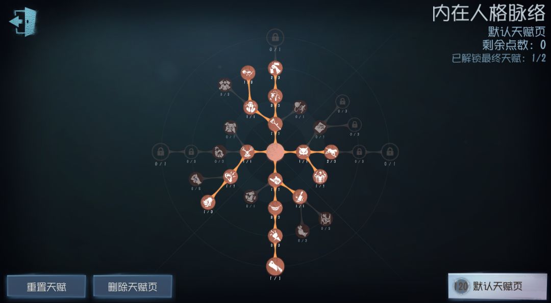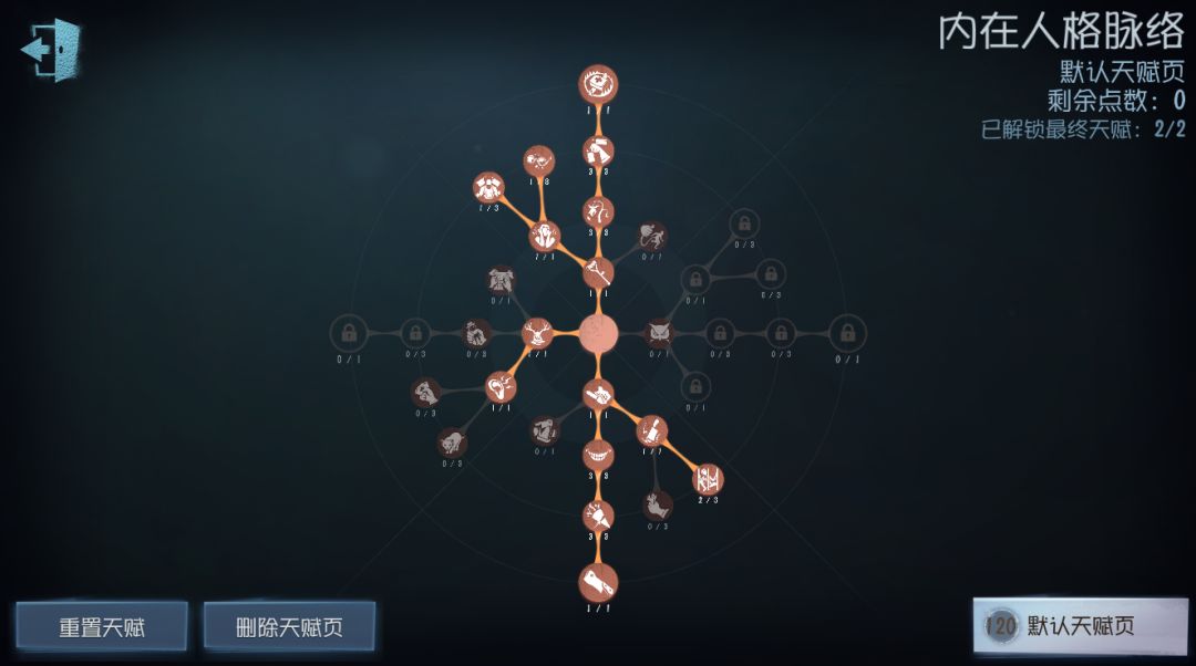 此套天赋相较于上一套天赋,少了【禁闭空间】与【拘禁狂】,但增加了【狩猎本能】、【困兽之斗】和【追猎】。因为没有点出【拘禁狂】,更依赖于前期节奏,所以推荐用于守椅压力小的大图,同时对熟练度与意识要求更高。