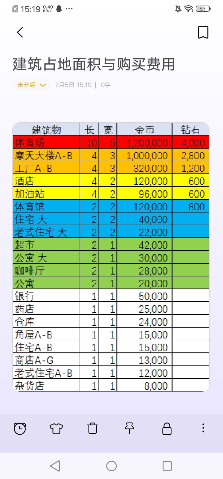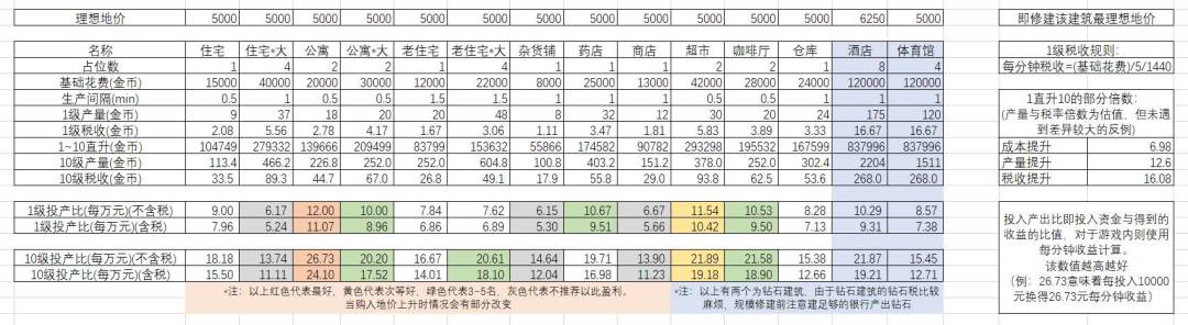 重要:经计算“杂货铺(车库)”的性价比并不是特别高。尽管在前期资金不足的情况下作为收入来源是很不错。但在有了一定的资金以后,还是建议造“公寓”比较好。(建筑性价比详细表3)