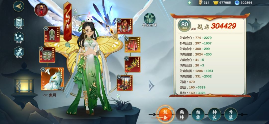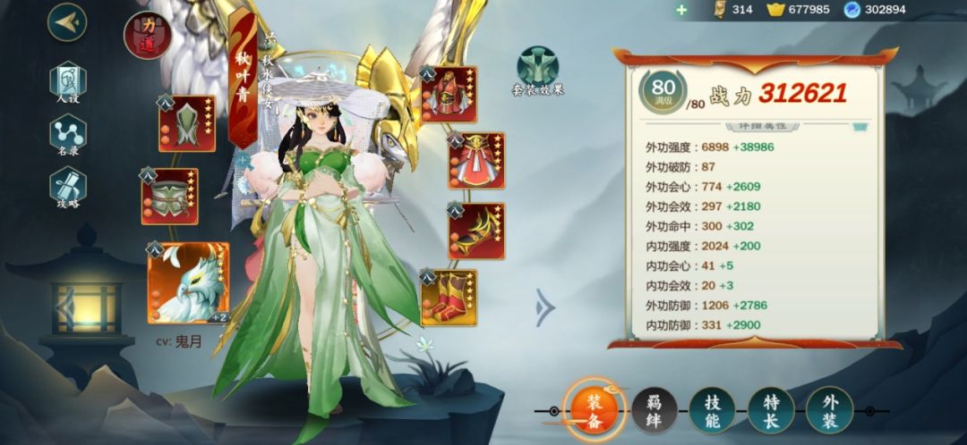 在第一套套装推荐时说过,秋叶青的特点是脆皮和缺内,所以使用三朔语时有效地缓解了秋叶青的内劲压力;二听风还是一如往常,必须要带着增疗;另外,散件必须是极散或者鬼工,否则就失去了意义,因为它必须补上一些属性来平衡这套装备。