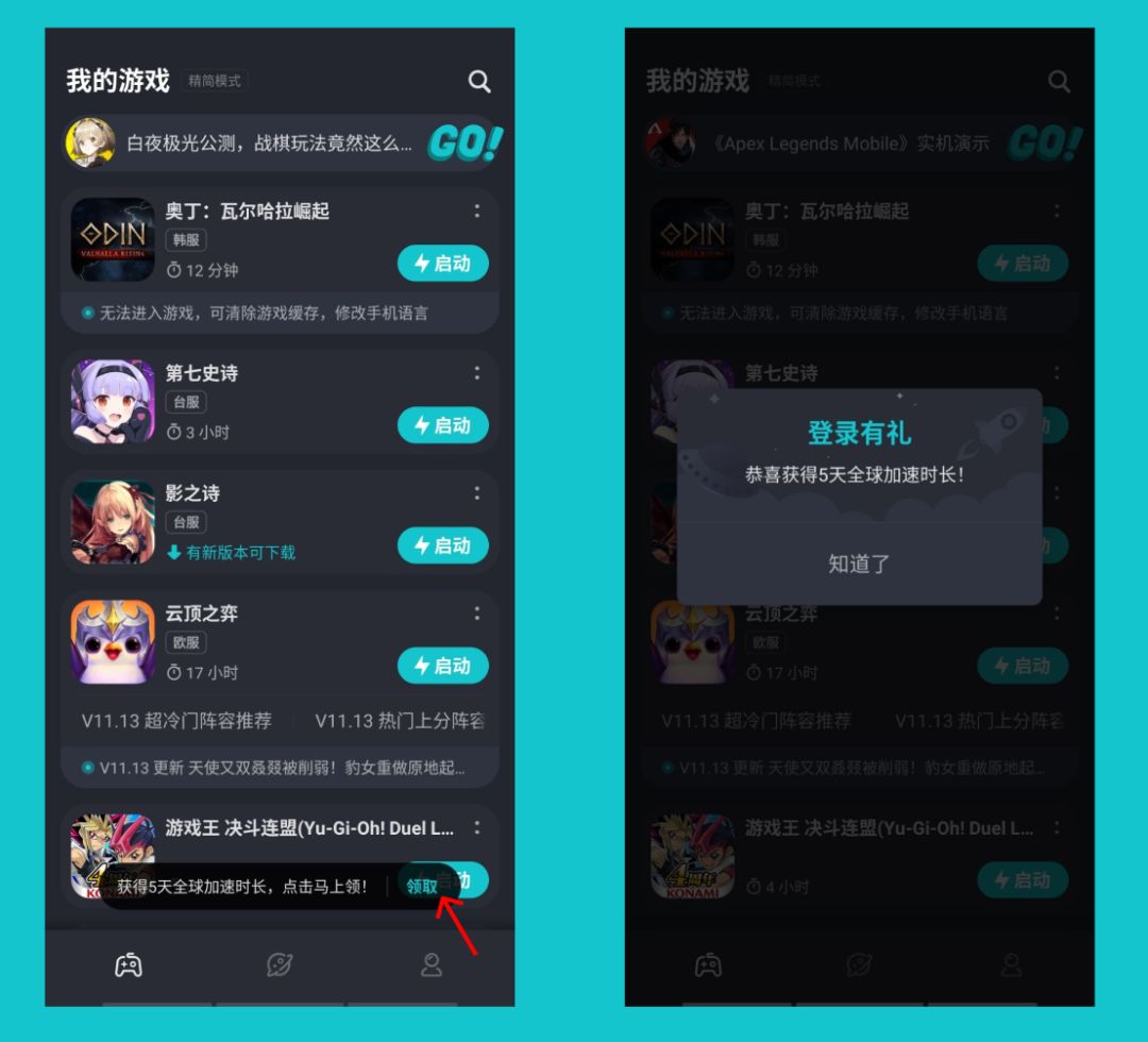 【第一步】:打开“我的游戏”,点击领取——5天加速时长到手!(到9月30日前,总共能领65天!)