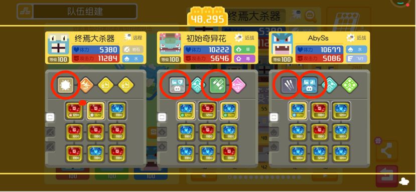 2,操作简单:每个宝可梦,配置的技能只有一到两个(如图红色圈圈)。