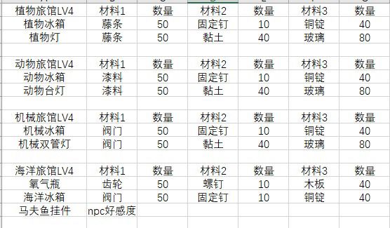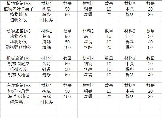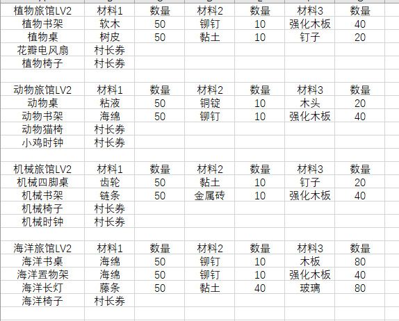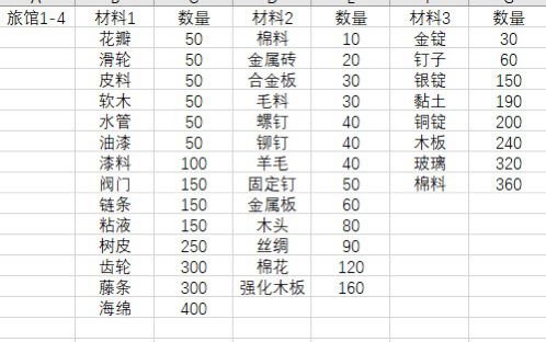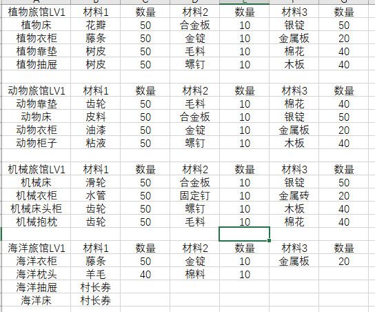 入坑4个多月,接下来准备搞旅馆了,平时船运材料都当垃圾卖了,现在很后悔,所以参考大佬的毕业旅馆图,整理了一份材料表,防止自己手贱 ,有不对的欢迎指正