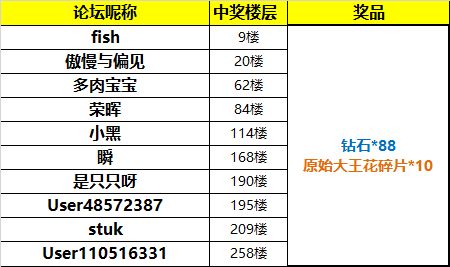 幸运奖(10名):钻石*88,原始大王花碎片*10