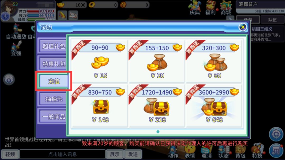 1. 点击商城的「充值」分页查看面额