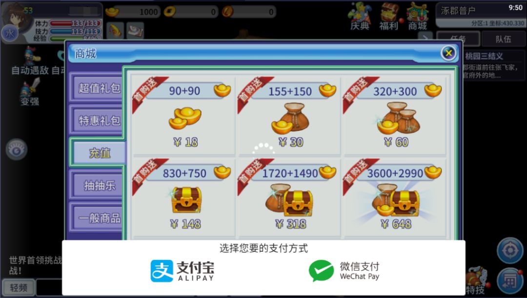 2. 点选想要购买的元宝数量后即可选择支付的平台