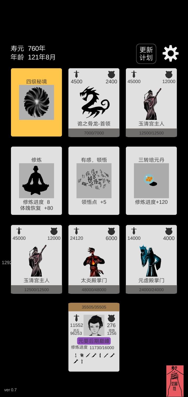 修真界180年1月,这是我来修真界的第166个年头,我炼虚了,我好像看到了更好东西,右下角那是?我的符?左下角呢?ver0.7?什么意思?左上角是我的寿命和年龄?右上角是个齿轮,更新计划?但什么是齿轮,为啥那样子是齿轮?算了,可能是进入炼虚然后习得的神通吧。不懂?