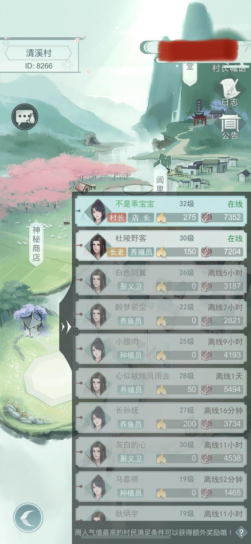村落8266招活跃玩家!二级商店,二级产业,三级聚义堂!