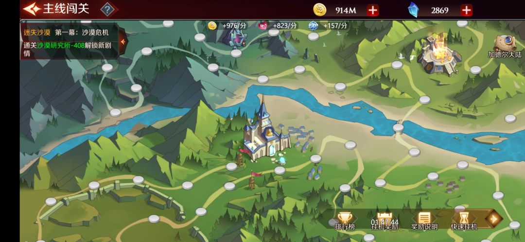 主线闯关,是《加德尔契约》的核心玩法之一。它是玩家角色经验的唯二获取途径(另一个就是闯关后的挂机收益),同时还提供一定量的金币、生命石(魔灵经验)、灵魂石,在某些特定关卡还掉落特殊奖励,包括符文箱、魔灵碎片等。