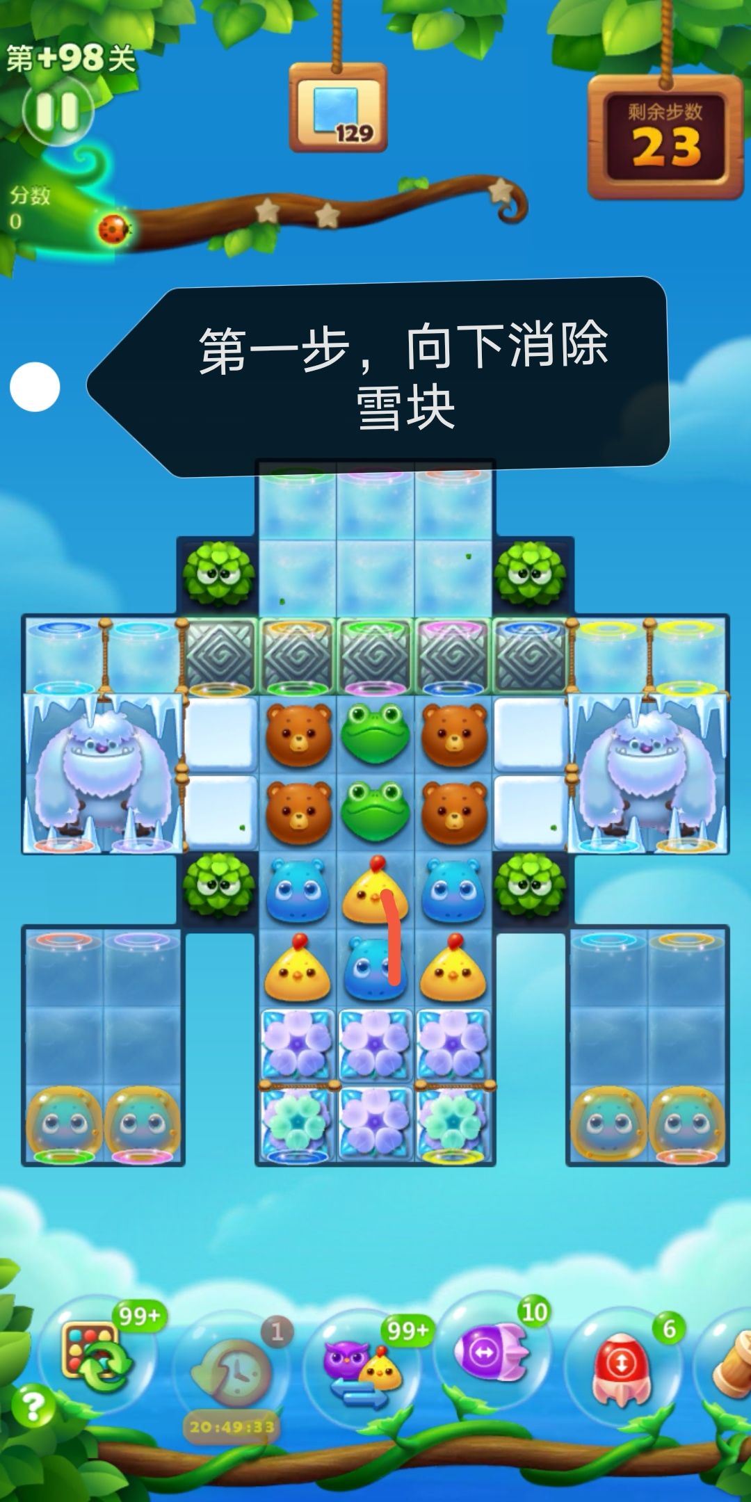 1.迅速向下打破雪块,打通传送门,让动物掉到雪怪上方。