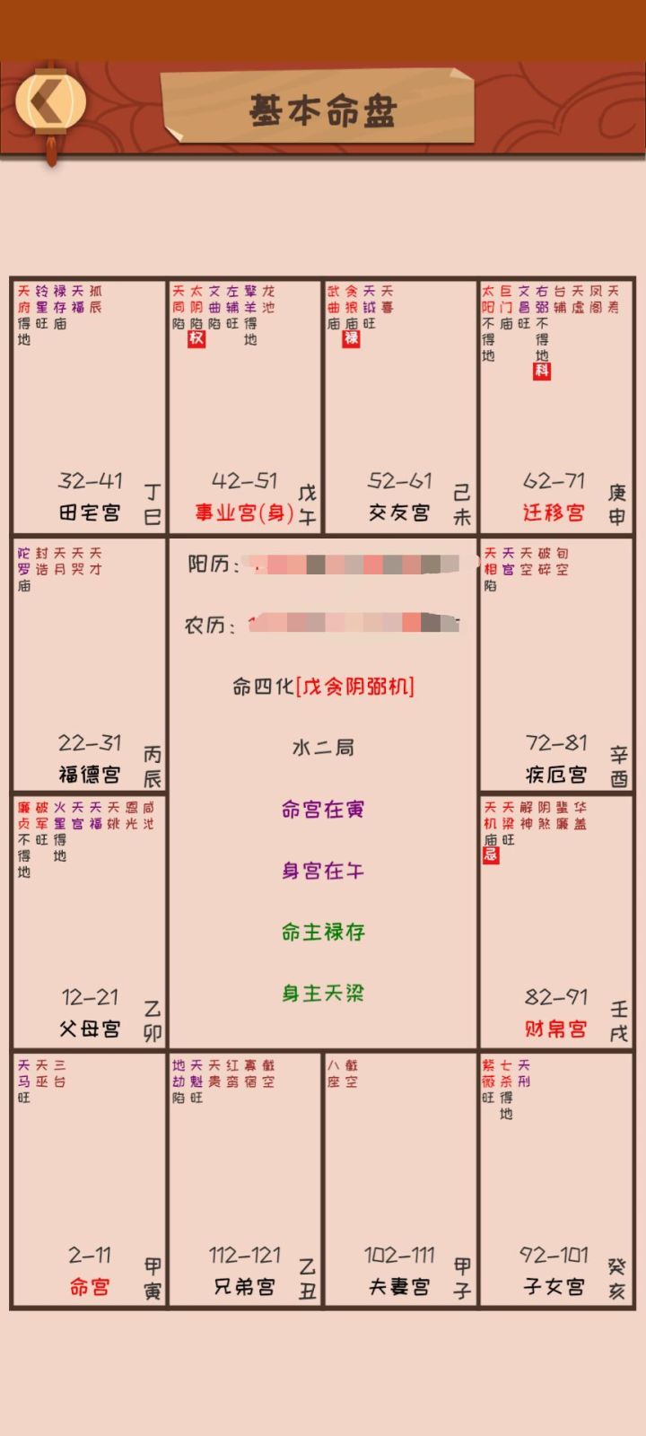 一开始是抱着半信半疑的心态玩玩看看,结果基本上都和我现在很像。突然很好奇这个命盘上写的什么,求大佬们看看。