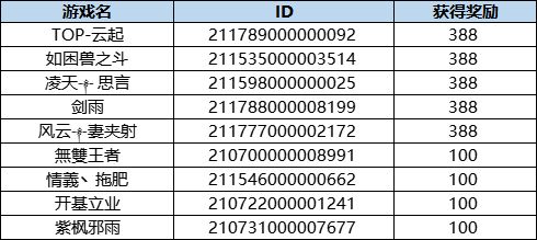 恭喜以下主公获得活动奖励,奖励会在7个工作日内发布到游戏ID邮箱内,请注意查收~
