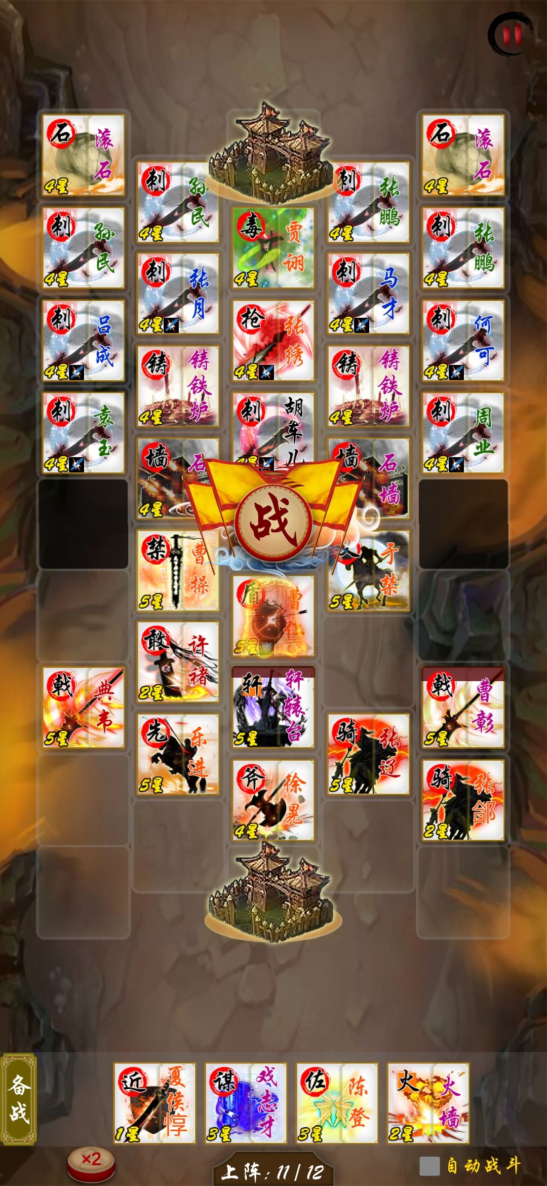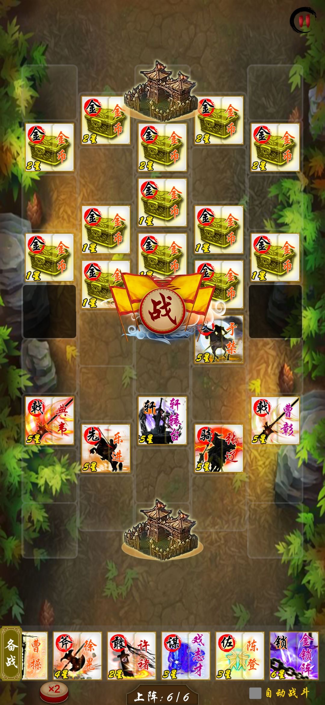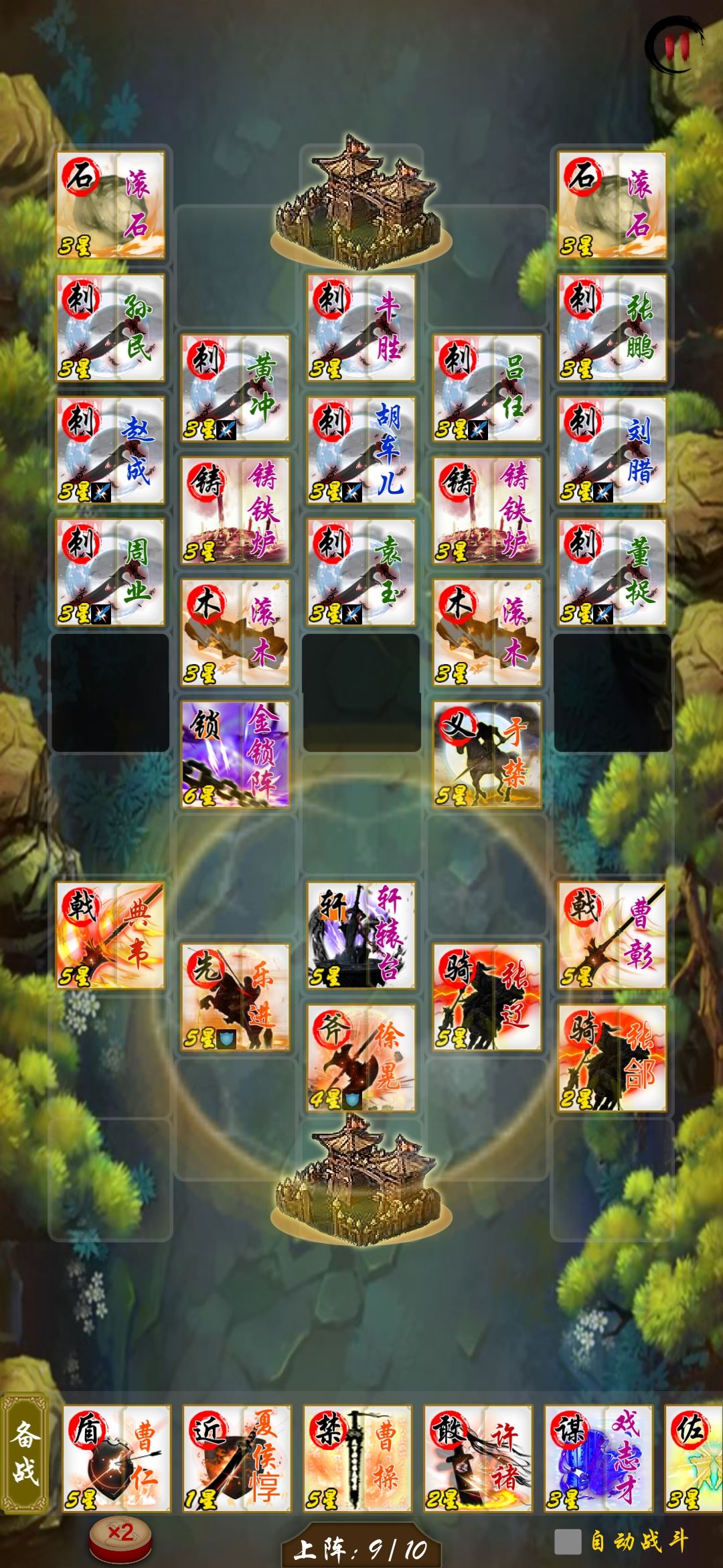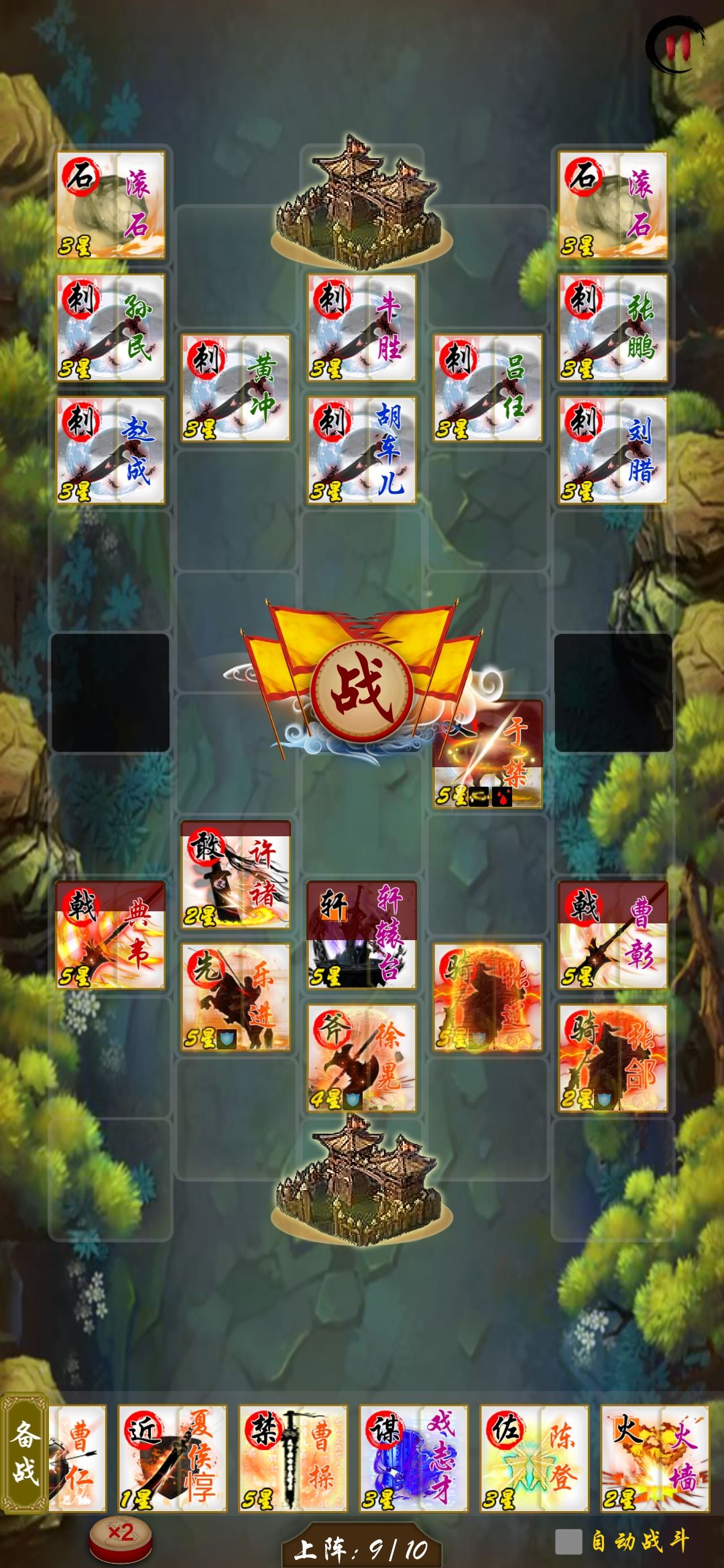 人口打开10人口 上9个人留一个位置备用,1 3 还是先不要着急上人。重点这里就是要把 2号位留出来的原因,先上金锁或是别的t 炮灰等 吃滚木 不然扛不住,像许褚被晕了就不敢死了。吃完滚木 自信星级或者上阵人数多 可以上主t也建议再2号位 最好也把五子齐了 看人品给于禁刷盾。