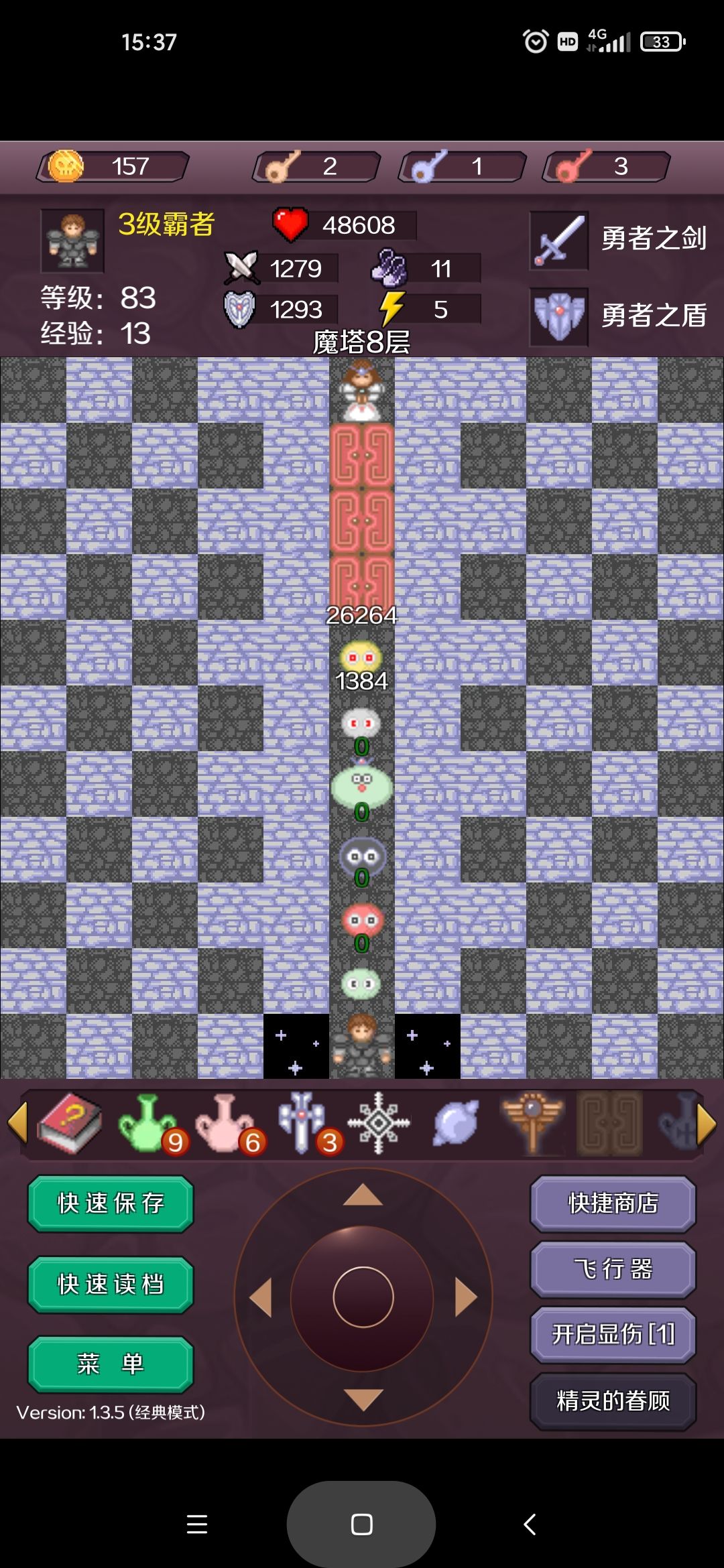 2.把能无伤干掉的小怪都清了,继续加攻击,经验可以留到地下再升级(20级可以升2级徽章,40级升3级徽章),然后到12层拿盾,18层拿剑,再打上20层鲨第一个假公主,我的当前属性为攻352,防72,血2000,这样主塔20层搞定了。