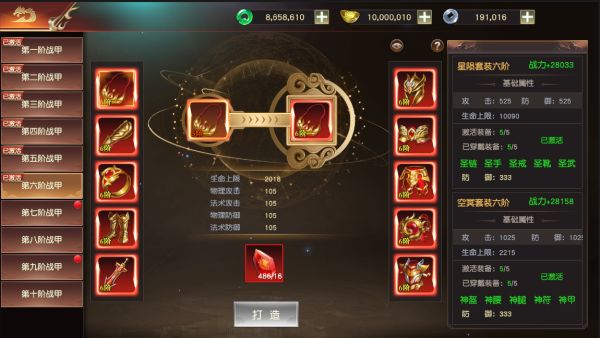 能加属性的星空战甲系统来了!新系统共有10阶战甲,每阶都有10个装备部位组成,不同的装备需要不同的材料激活。每个装备部位激活后都会获得属性加成!