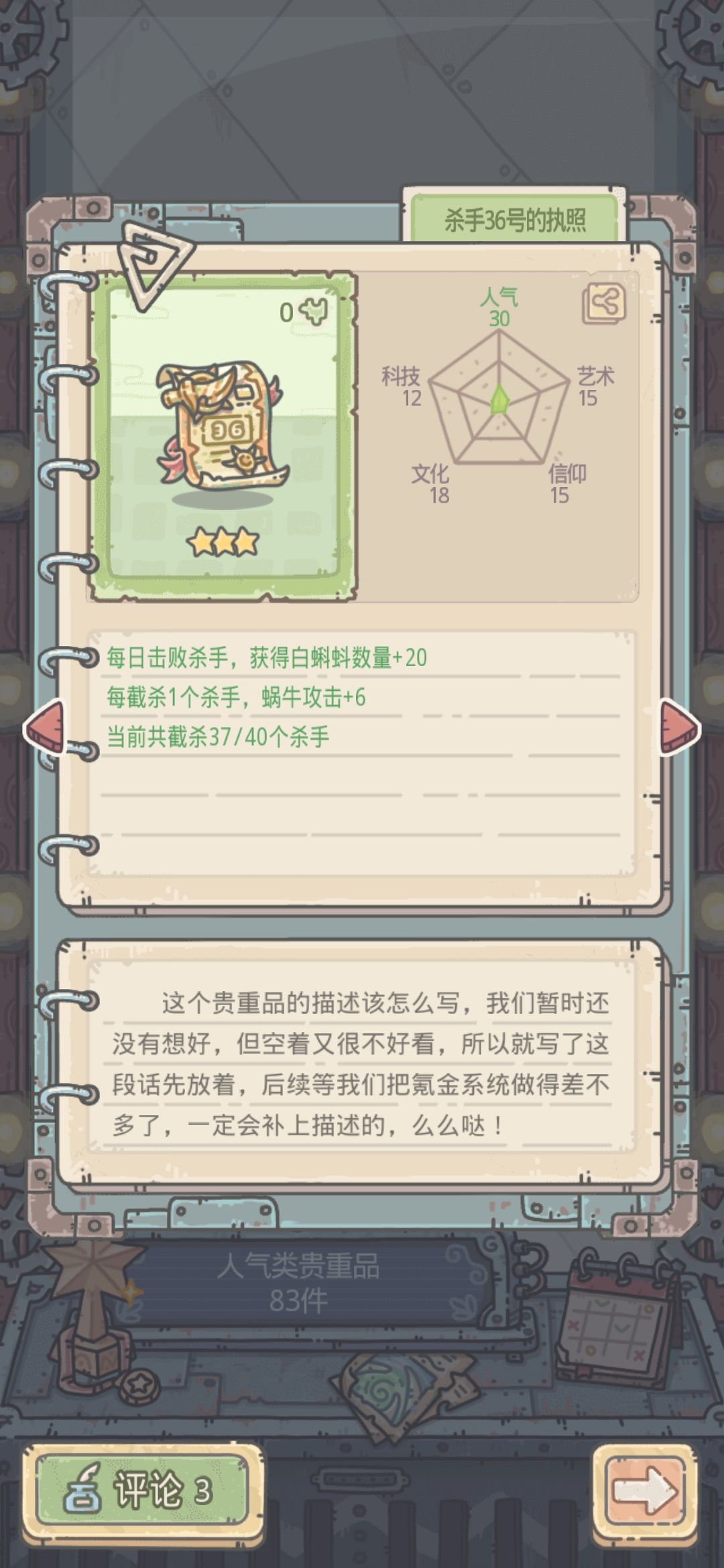 绿贵:杀手12号的执照(每日击败杀手,获得白蝌蚪数量+15。每截杀一个杀手,蜗牛攻击+6、0/40)
