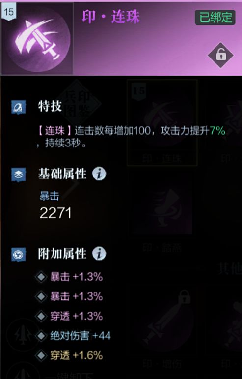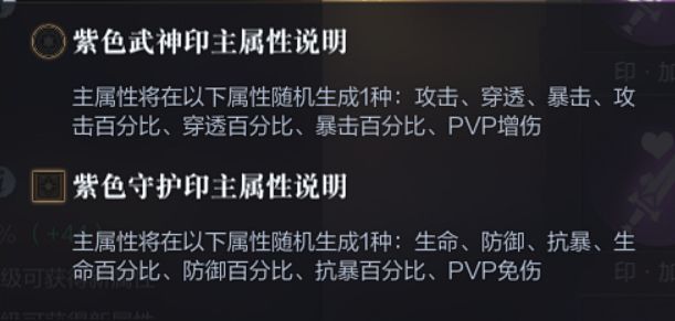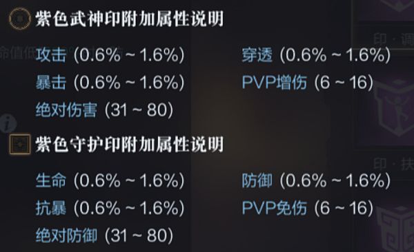 与各自的名字非常契合,武神印的特技,主要集中在增伤、提高攻击力;基础属性涵盖了攻击、穿透、暴击、pvp增伤等种类。