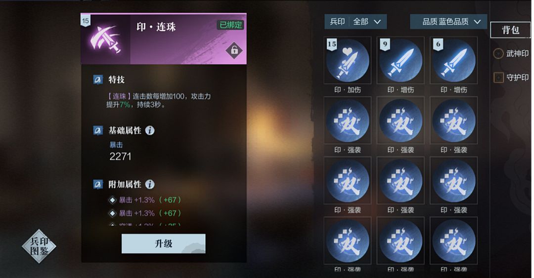 兵印分为武神印与守护印两大种类,每一个兵印都有一条特技以及一条基础属性,使用其他兵印作为材料,可以让兵印升级,而随着兵印分别升至3级、6级、9级、12级、15级时,还可对应获得1条附加属性。