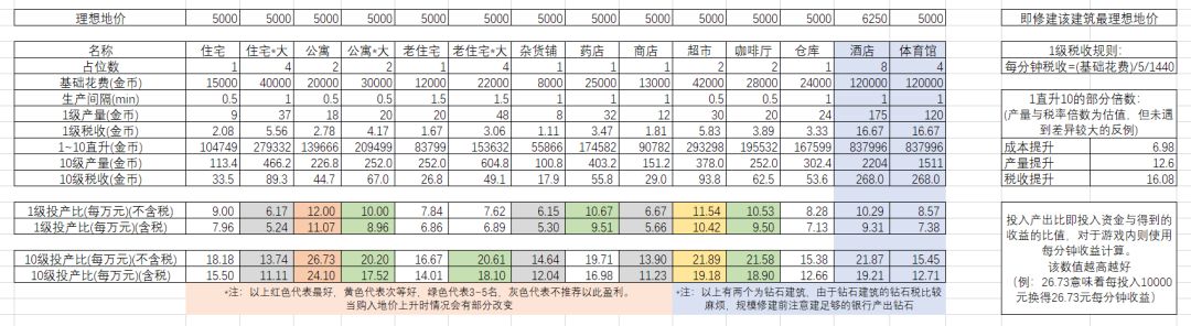 在埋头建建建的空余,刷论坛发现别人对建筑收益的误解都蛮大的,所以就把统计的数据综合了一下,熬夜整理出了一份表解释各建筑的收益。(注:下图1~10直升的金额是旧版本的)