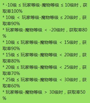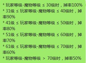 1. 当魔物的等级与自己的 Base 等级相差在 ±30 级,魔物掉率为100%;等级差超过31级时,掉率只有正常收益的 90%,当等级差超过 41级时,掉率只有正常收益的 80%。