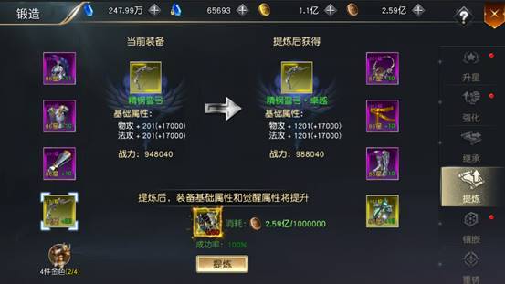 Ø 界面两侧显示装备栏,下方显示目标,完成目标获得属性加成,界面中间显示当前装备和提品后得到装备,下方显示提品消耗,成功率为100%。