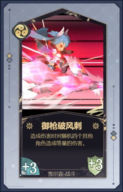敌我不分的大杀四方来了(也可能随机打到双方牌手)。注意随机对象是攻击目标以外的未气绝角色,如果直接打脸敌方牌手就不会再随机到对面牌手(但是可能打脸自己XD),如果自己其他式神都气绝了,这张卡就很可能把对面全员送走(那反过来说岂不是......)。
