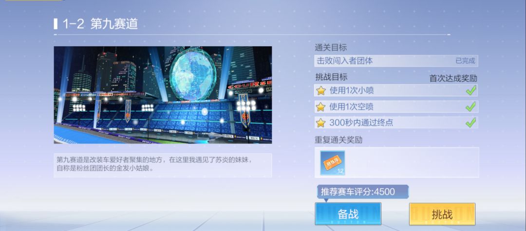 第1章的8个挑战关卡中,其中除了1-2的第九赛道挑战关卡中可以使用赛车手拥有的赛车外,其他的挑战任务都需要使用关卡制定制的赛车。这也是考虑到不同赛车类型在比赛中的数值表现不同,无法更好的帮助赛车手体验掌握技巧后驾驶的速度提升感。因此,只要技巧掌握得好,基础车一样可以carry全场,成功通关。