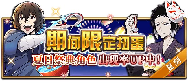 期间限定扭蛋:SSR【夏日祭典】太宰治、 SR【夏日祭典】芥川龙之介。